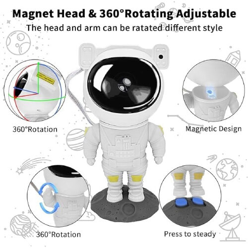 - 360-Degree Rotating Head for Full-Room Projection – The astronaut’s head rotates a full 360 degrees, allowing the projection to cover every corner of your room. Adjust the direction of the light to focus on walls, ceilings, or create an all-encompassing galactic environment.