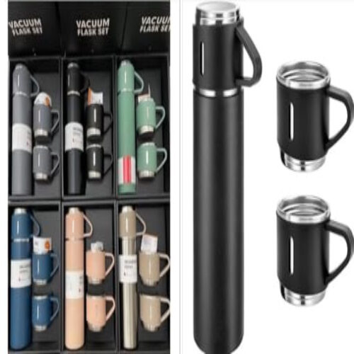 Double Wall Stainless Steel Thermo 500ml Vacuum Insulated Bottle Water Flask Gift Set with Two Cups Hot & Cold | Assorted Color | Diwali Gifts for Employees | Corporate Gift Items.